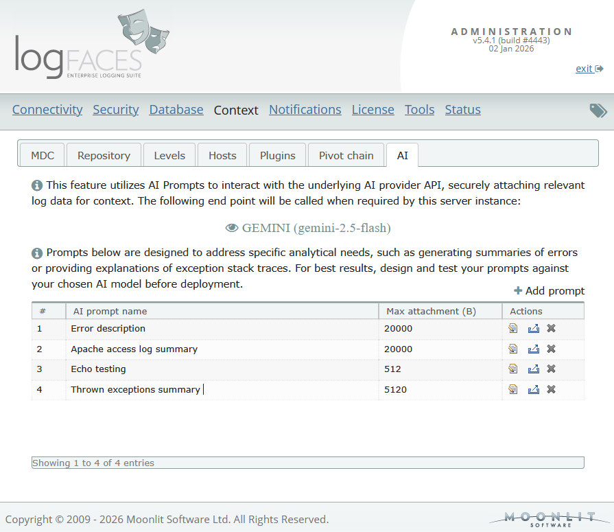 The logFaces server integrates with remote Large Language Model (LLM) providers to facilitate automated interpretation and summarization of log data across the platform. This integration is comprised of two core components: selecting an AI service provider and designing environment specific prompts.